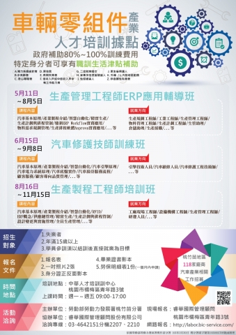 勞動部勞動力發展署桃竹苗分署委由睿華國際於北部地區建置「車輛零組件產業人才培訓據點」,課程內容除與業界、學界共同規劃外,並結合產訓合作的方式,提供學員至企業實習,提升學員專業知識與實務技能,並於訓後輔導學員就業。