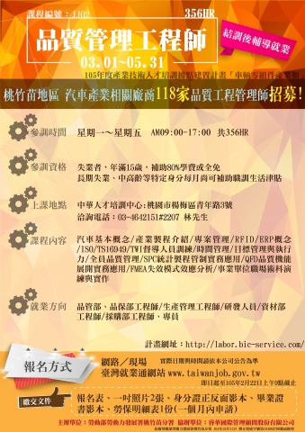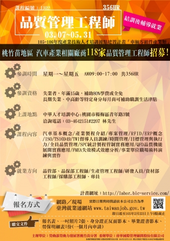 勞動部勞動力發展署桃竹苗分署委由睿華國際於北部地區建置「車輛零組件產業人才培訓據點」,課程內容除與業界、學界共同規劃外,並結合產訓合作的方式,提供學員至企業實習,提升學員專業知識與實務技能,並於訓後輔導學員就業。